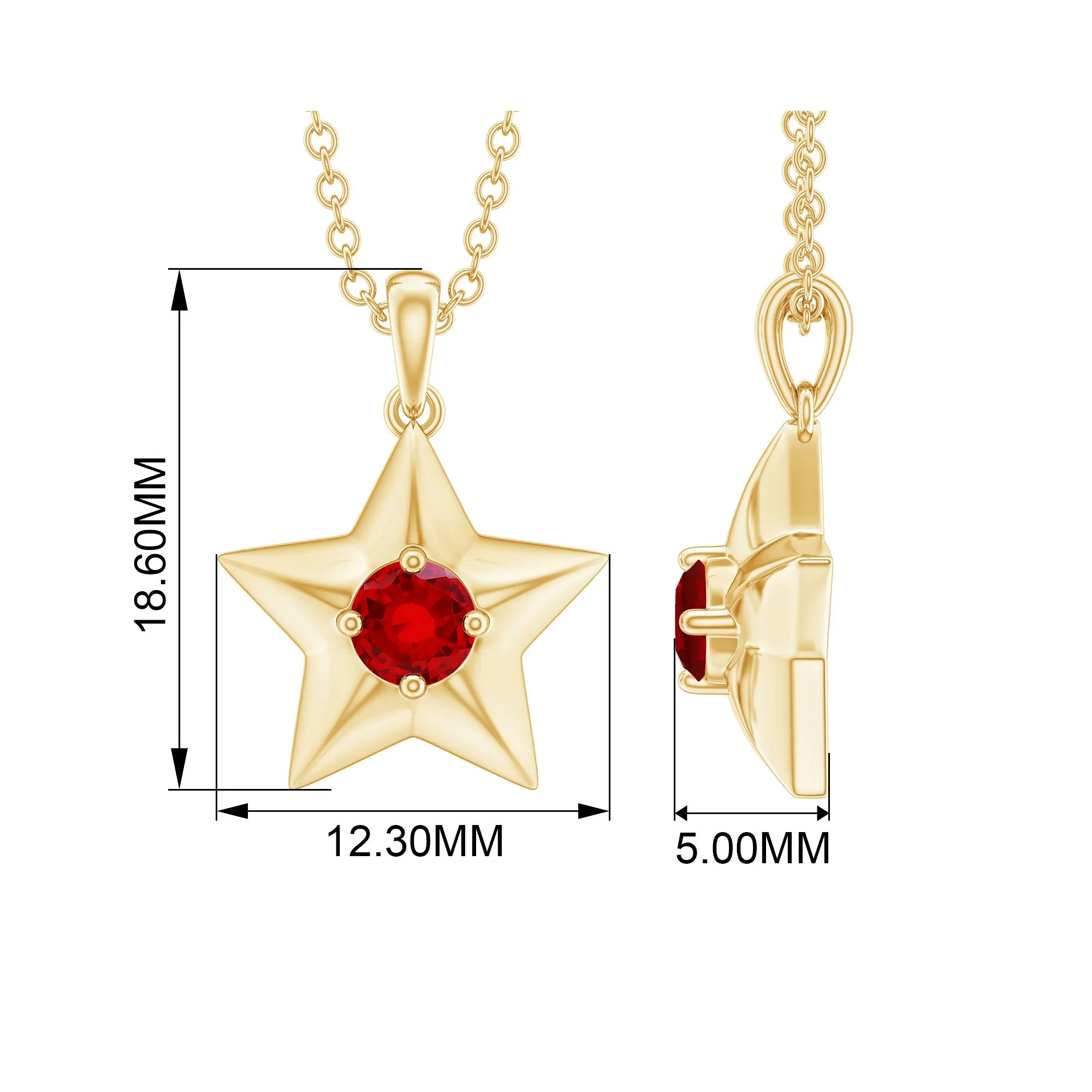 Elevate your style with this exquisite Star Pendant adorned with a dazzling Round Shape Created Ruby gemstone. The Created Ruby Gold Star Pendant is a one-of-a-kind piece that will add a touch of sophistication to any outfit. Perfect for a woman who wants to stand out from the crowd and express her individuality. Get yours today and let it shine bright like a star.