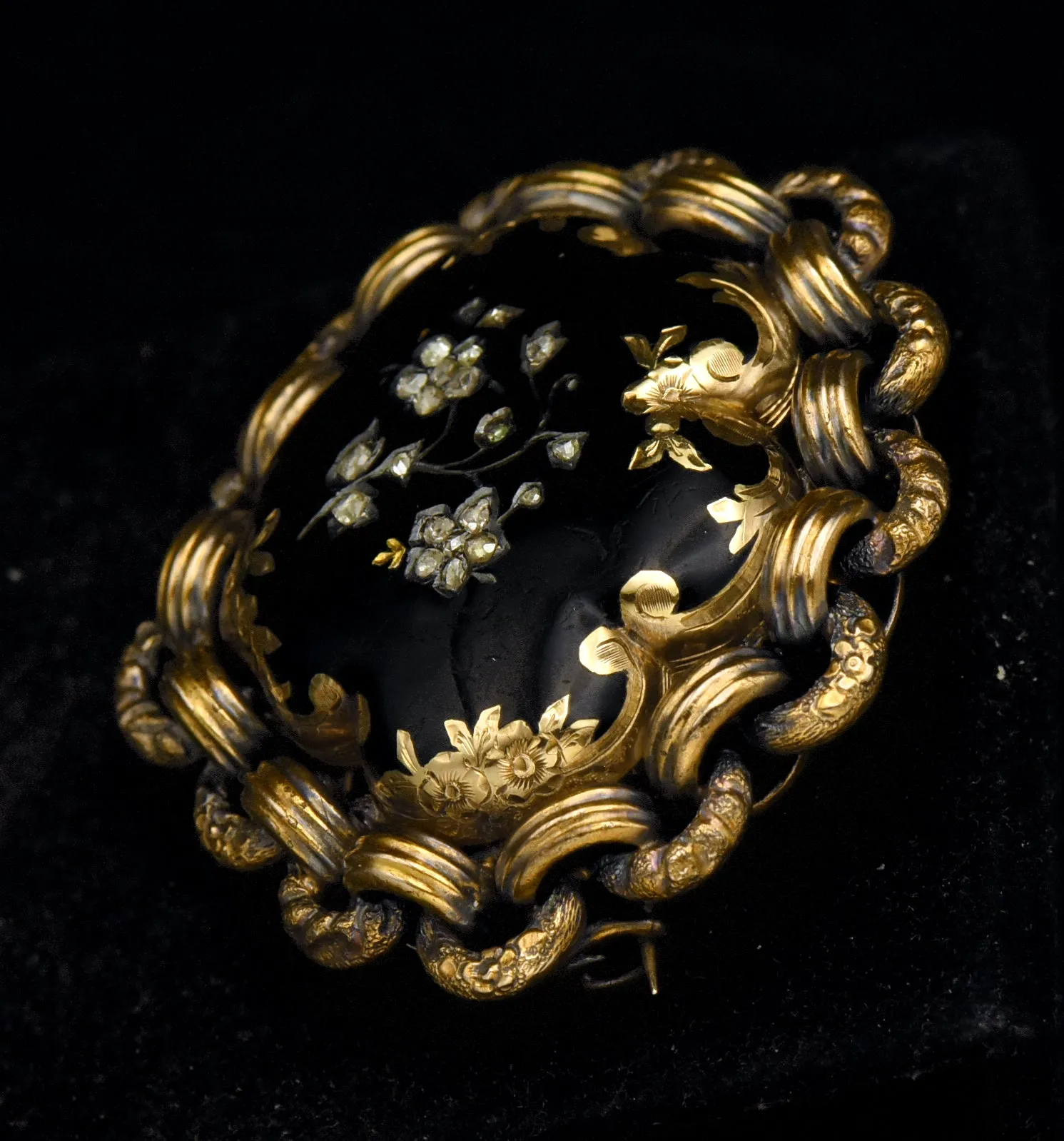 Beautiful antique parure consisting of a pocket watch, a brooch that the pocket watch can hang from (detachable), and a smaller brooch. All of the items are made of 18k gold, decorated with black enamel, floral engraving and rose cut diamonds.