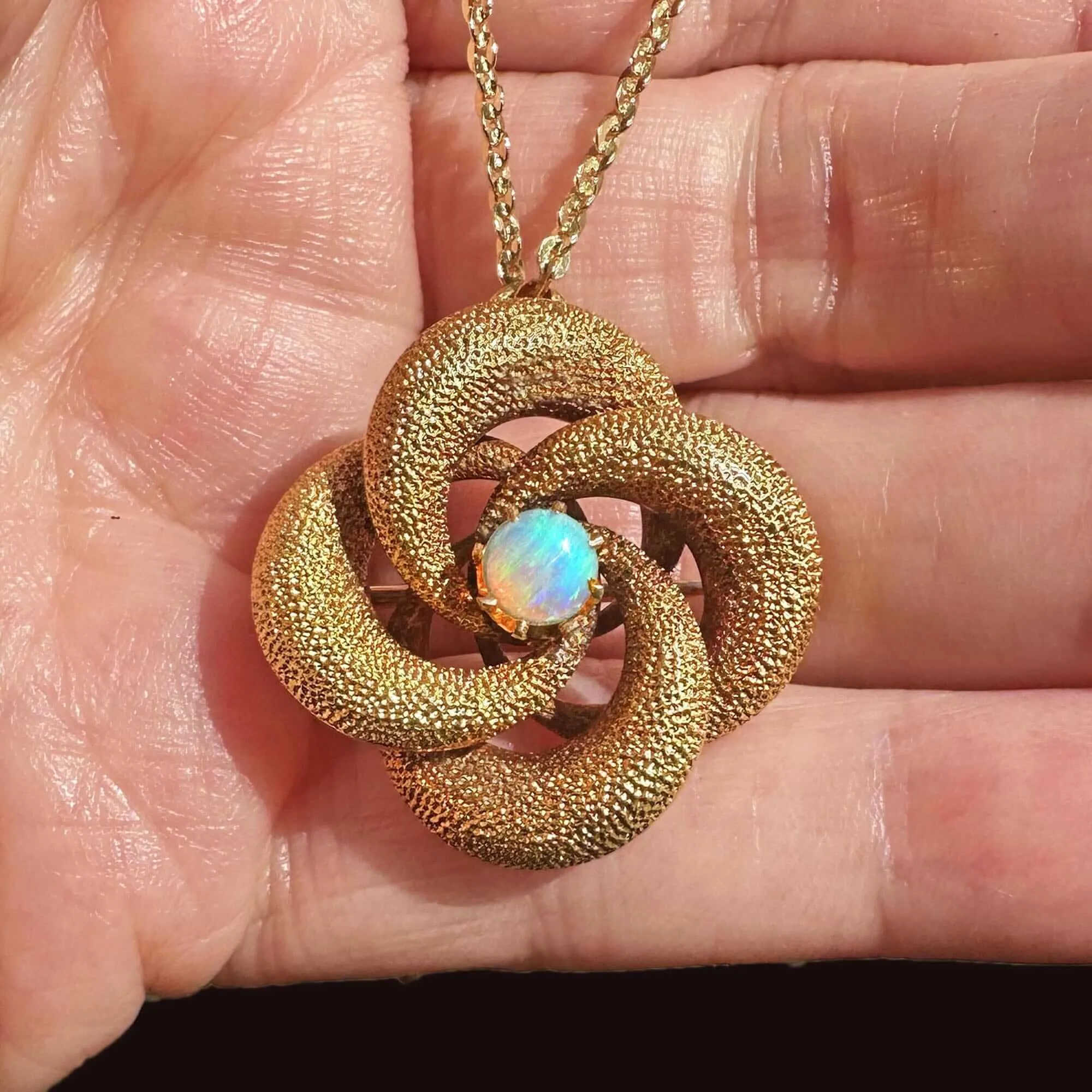 This Antique 18K Gold Lovers Knot Opal Brooch Pendant features four crescent moon sections intricately crafted in yellow gold, encircling a dazzling natural opal. The prong-set cabochon center glimmers with mesmerizing blue and green tones. Plus, with a flip bale on the back, this brooch can also be worn as a pendant. The unique design, known as a lovers knot, was a beloved symbol of everlasting devotion during the enchanting Victorian and Edwardian periods. Perfect for anniversaries, weddings, or as a special treat for your significant other, this versatile piece will surely delight