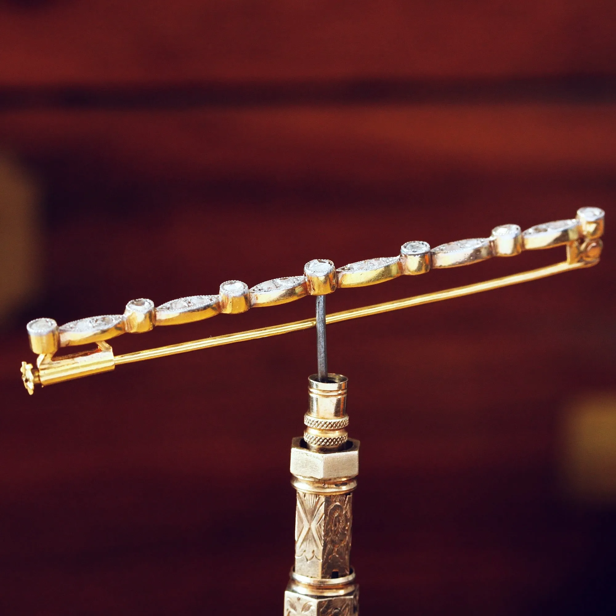 Hand crafted with great skill and care, an antique Edwardian era bar brooch set with nineteen old hand cut Rose Diamonds (these are flat backed and faceted to the top surfaces, shown in figures 3 and 6 of the diagram photograph). Of 18ct yellow gold with the finest of milgrained Platinum to the gems, all is a pristine Edwardian dream.