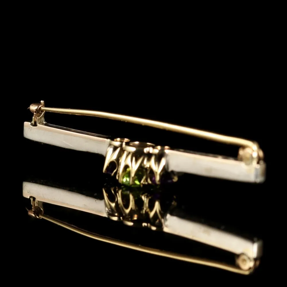 Set with a central rich green Peridot with one Amethyst at either side, which is then followed by glistening rose cut Diamonds.