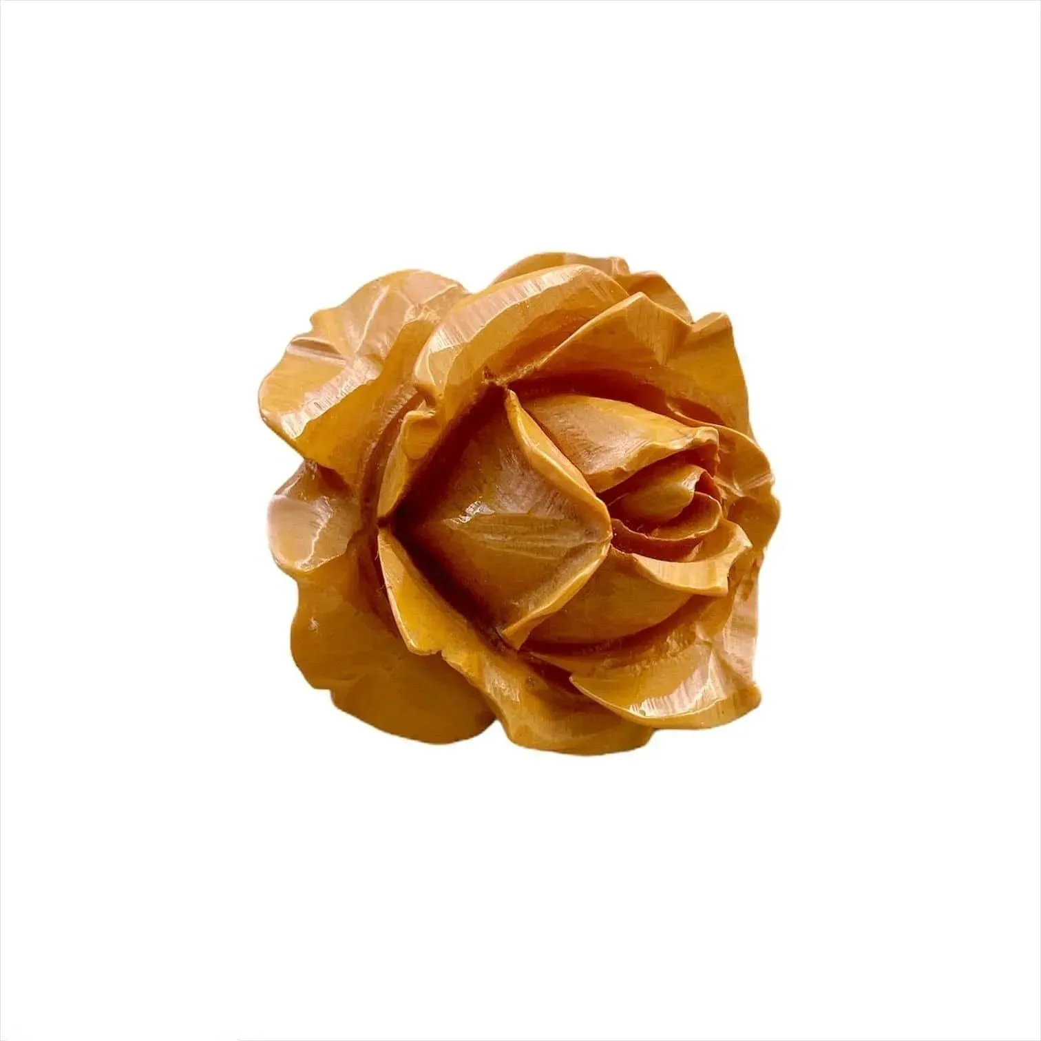 Bakelite deeply carved rose flower vintage brooch great attention to detail with dimensional layered petals unfolding in high relief. It has its original pin back with C clasp in place secure and working.