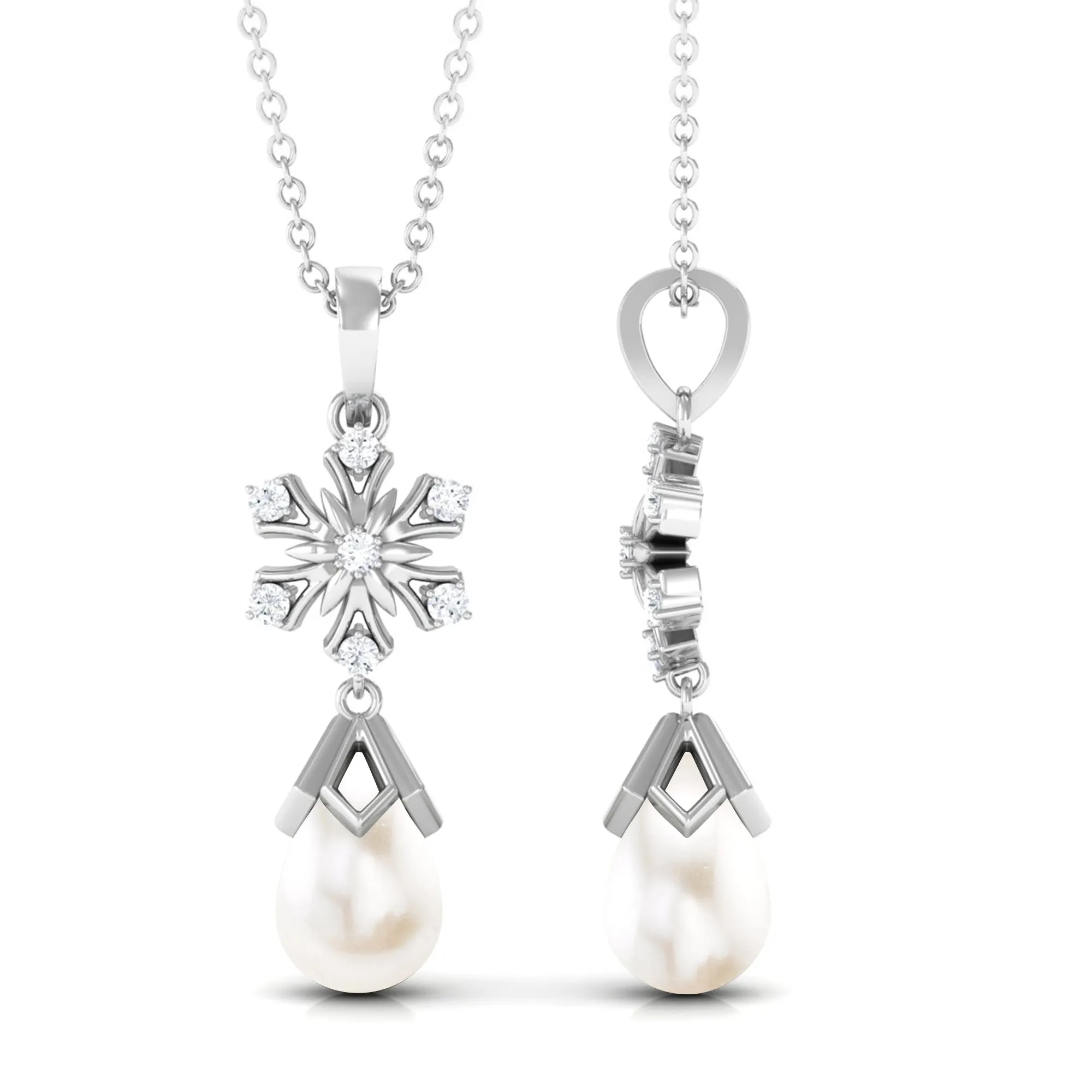 This Dangle Drop Pendant captures the enchanting beauty of winter. Features sparkling Diamonds studded on a snowflake design while a Drop Shape Freshwater Pearl adding a touch of elegance. Adorn your neck with this Pearl Pendant and let it become a cherished part of your jewelry collection, destined to spark conversations and turn heads wherever you go.