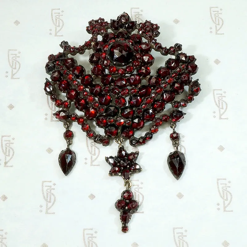 The Victorians loved the Dark Sparkle of garnets and so do we. This beautiful antique Bohemian garnet brooch has got it all, with rose cut garnets set in the airy Belle Epoque style. Swags, flowers, stars and dangles, oh my! A many petaled flower sits in a "V" shaped band of garnets. It is crowned with three smaller flowers and the whole piece is swagged with "ribbons" of garnets. A star-shaped dangle supports another small cluster of stones and is flanked by two more inverted teardrop-shaped dangles. So elaborate. The garnets are set in jeweler's brass, also called garnet gold for its popular use in the Bohemian garnet jewels of the era. This piece is beautifully constructed, with layers of brass riveted together to create depth. It has both a pin and a bale, so it may be worn as both a brooch and a necklace. Circa 1880.