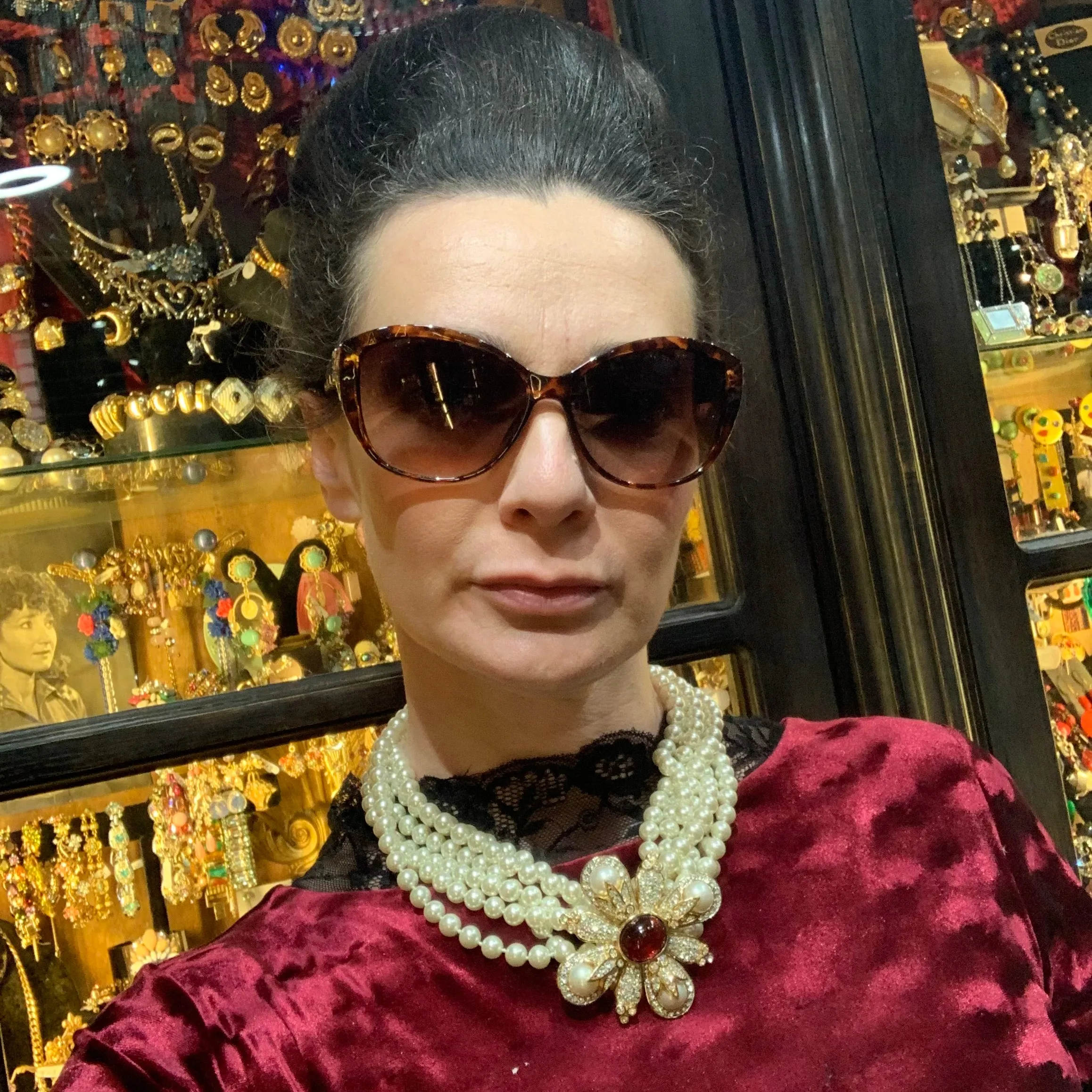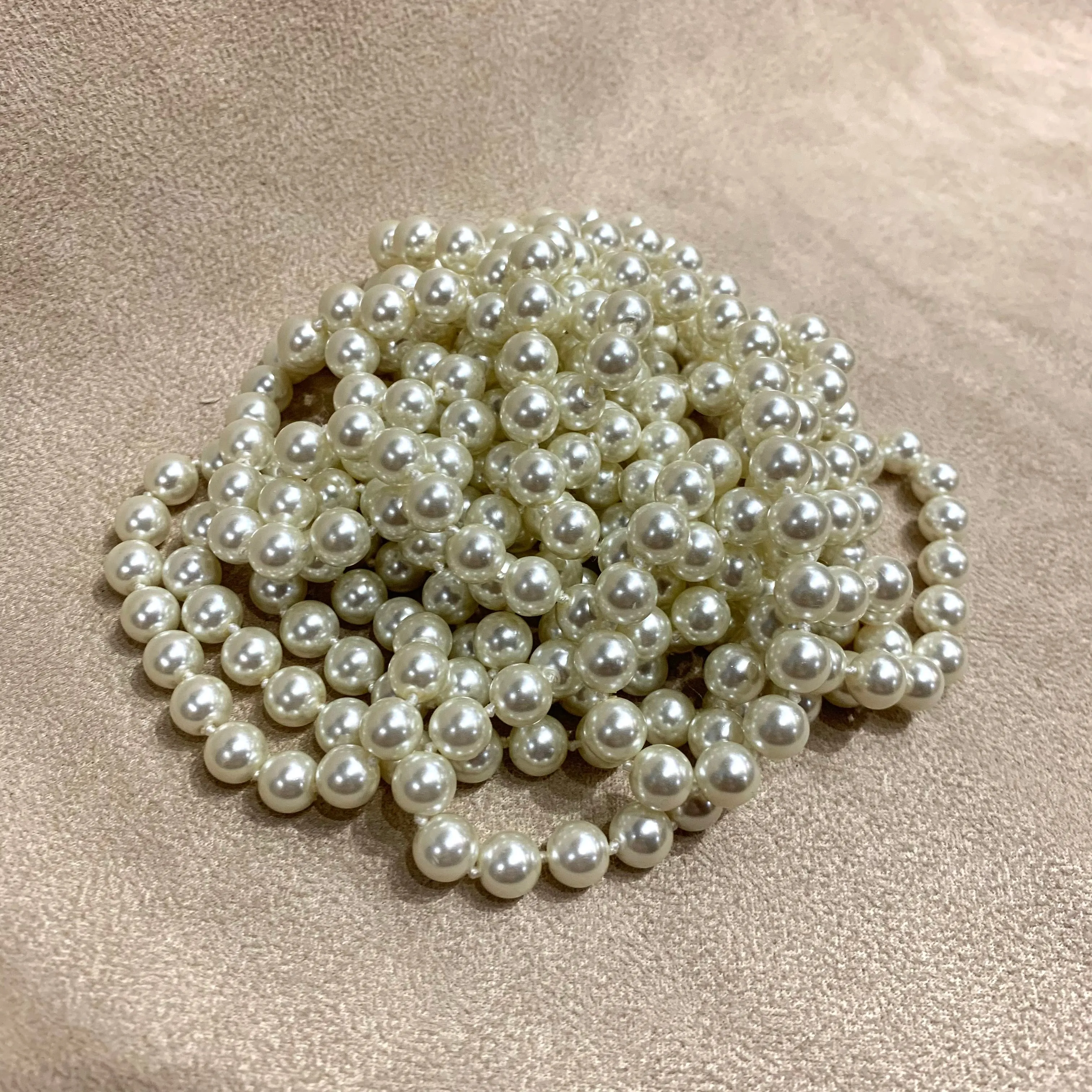 An unusually lone and versatile glass pearl necklace. Beautifully strung with knots in between each bead.