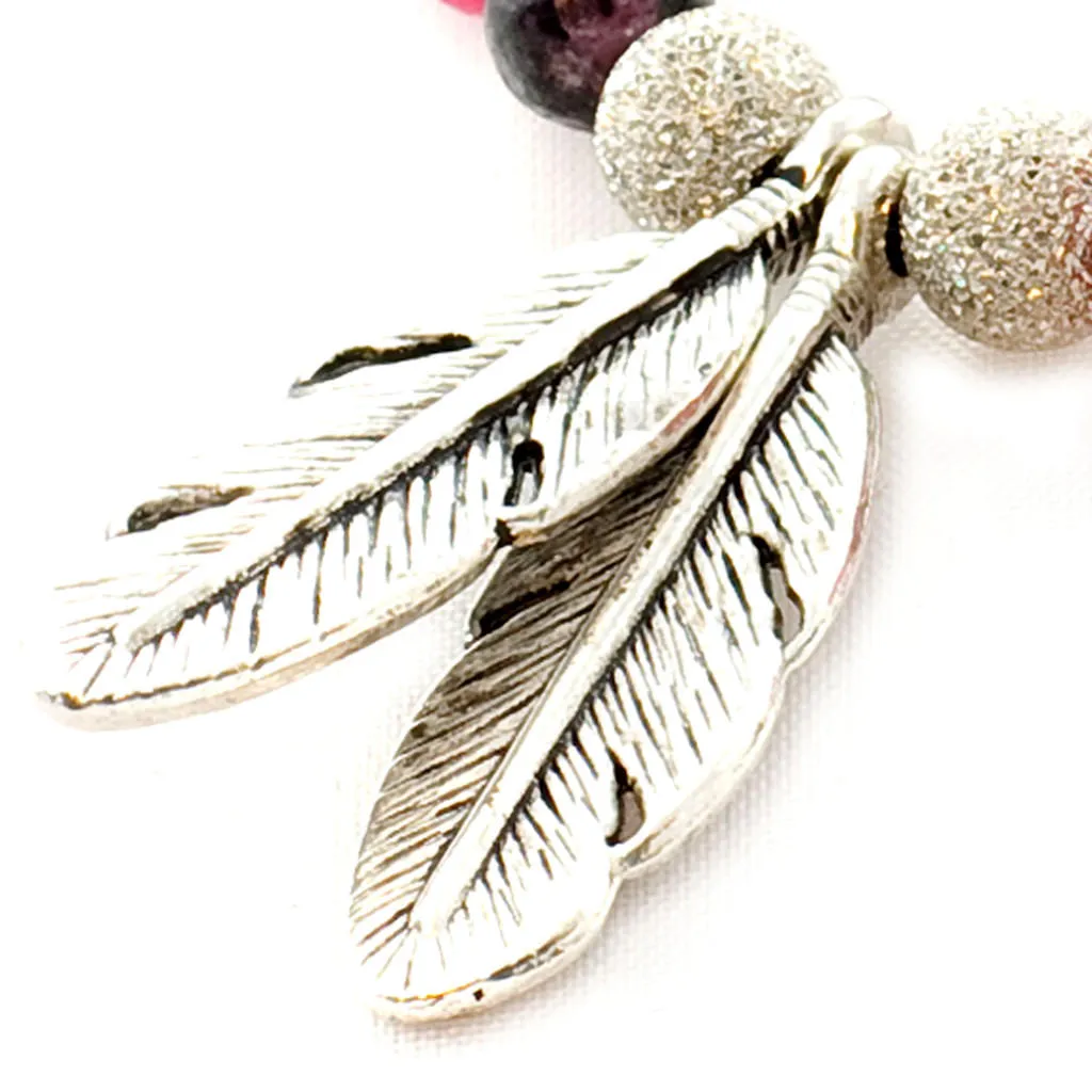 Our feather charm gemstone duo bracelet features a pair of beautifully sculpted plated feather charms on a 4mm stardust and 6mm gemstone beaded bracelet in your choice of 2 different gemstones from our wide selection of semi precious gemstone beads. This bracelet is handmade on strong elastic cord complete with our logo tag finish.