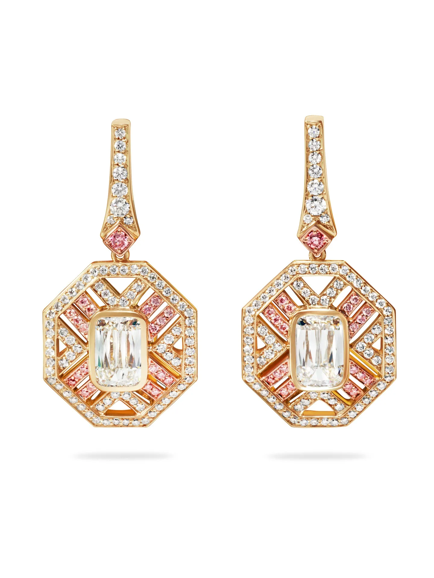 A pair of Fifth Avenue design earrings set with Ashoka cut diamonds and white enamel in 18 carat Single Mine Origin French gold. The main Ashoka diamonds are certificated 0.74 carats FVVS2 and 0.72 carats FVS1. The total weight of the additional brilliant cut pink diamonds is 0.14 carats and white diamonds is 0.73 carats. By Boodles.
