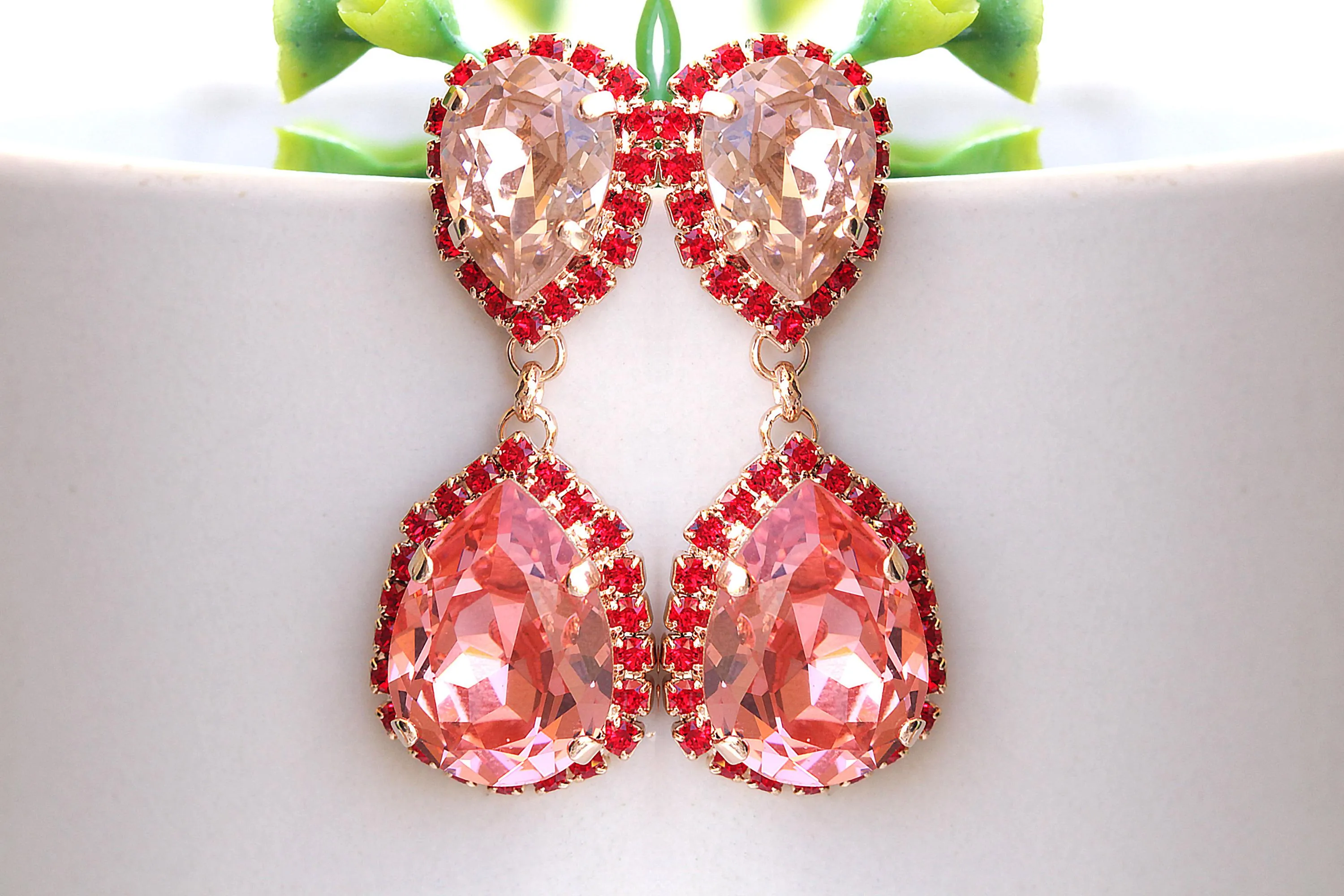 Light Red Earrings, BLUSH EARRINGS, Cocktail earrings. Women's earrings. Chandelier earrings. Red Gold Long Earrings, Red Dangle Earrings