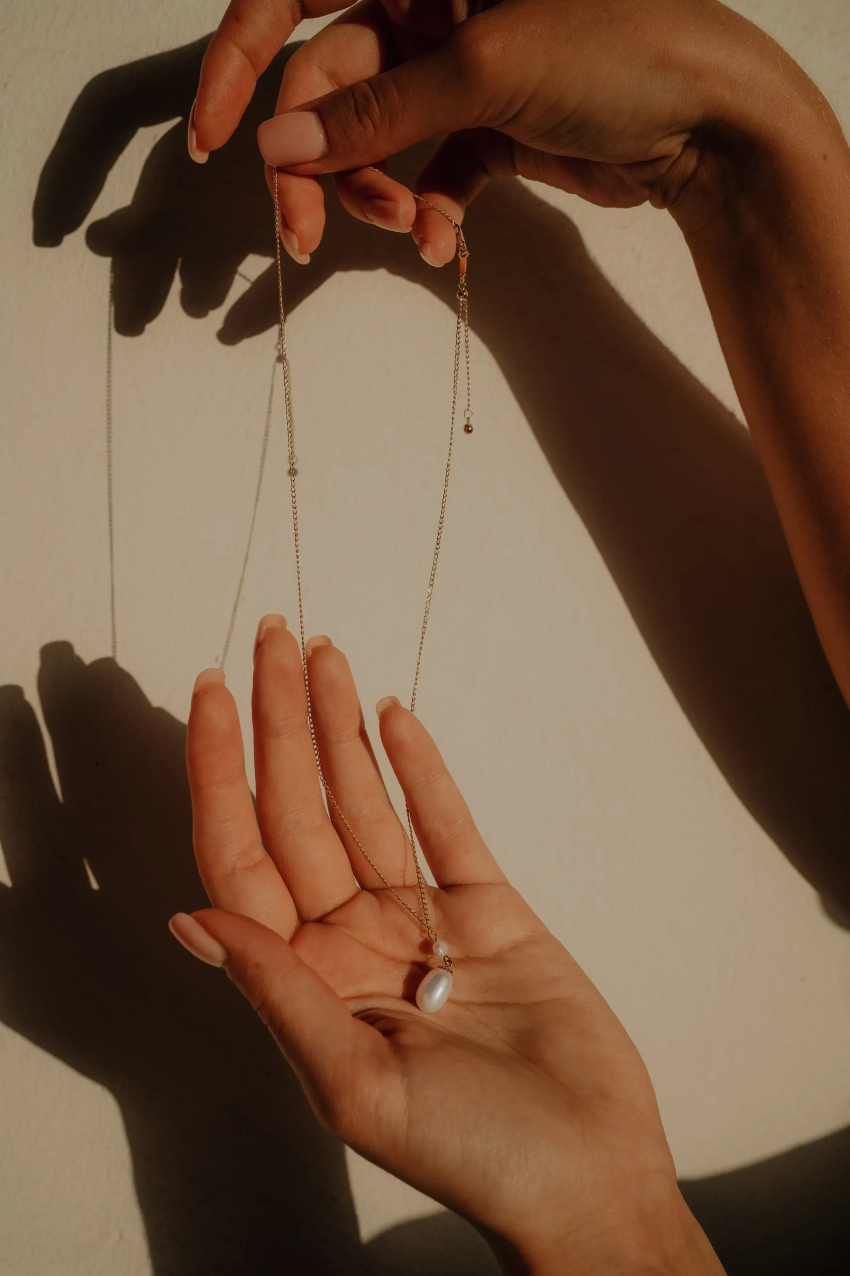 The Mia Necklace is handcrafted with a fine 14k gold-filled adjustable-length curb chain and delicate freshwater pearls.