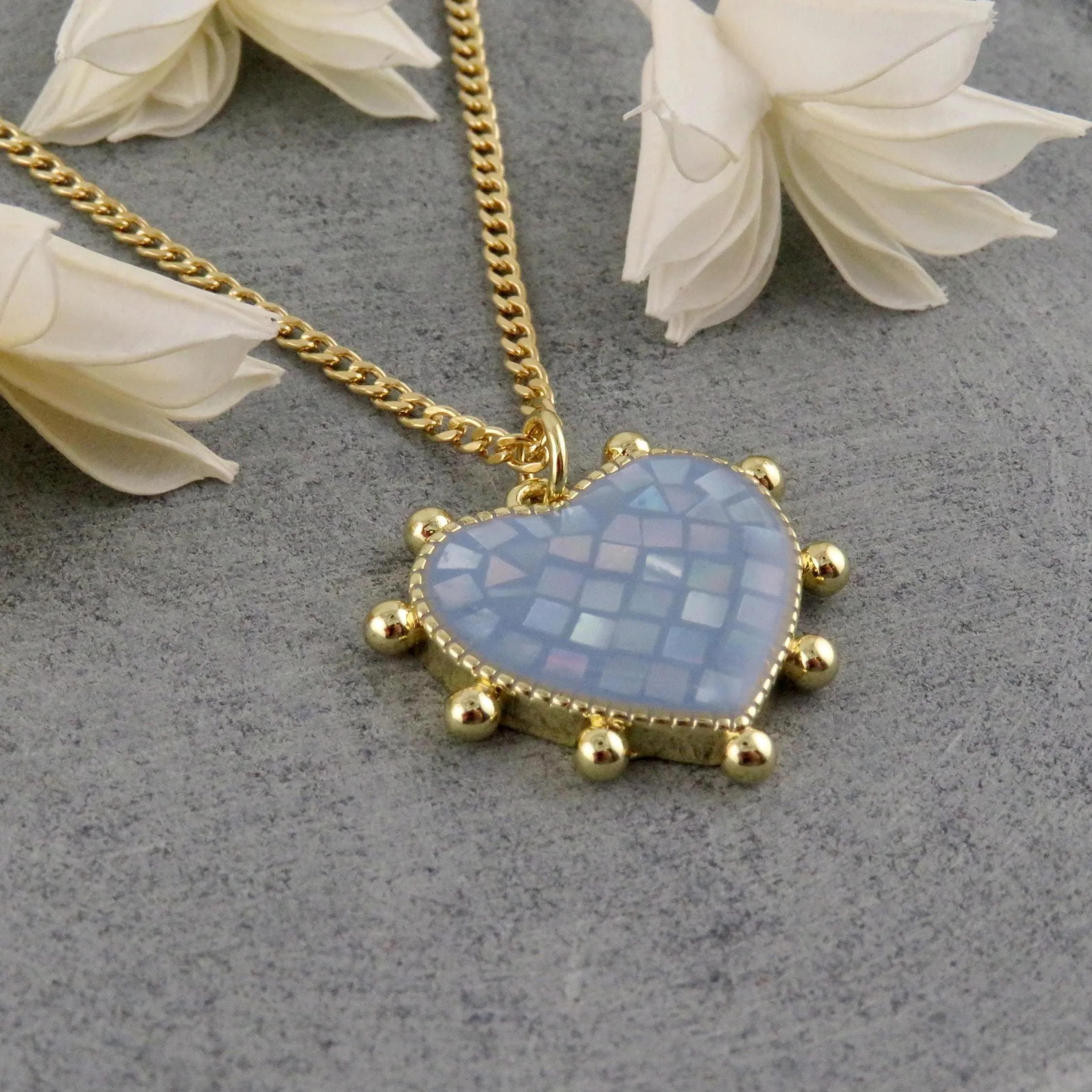 A charming gold filled mosaic pearl heart with unique detail on a gold filled chain