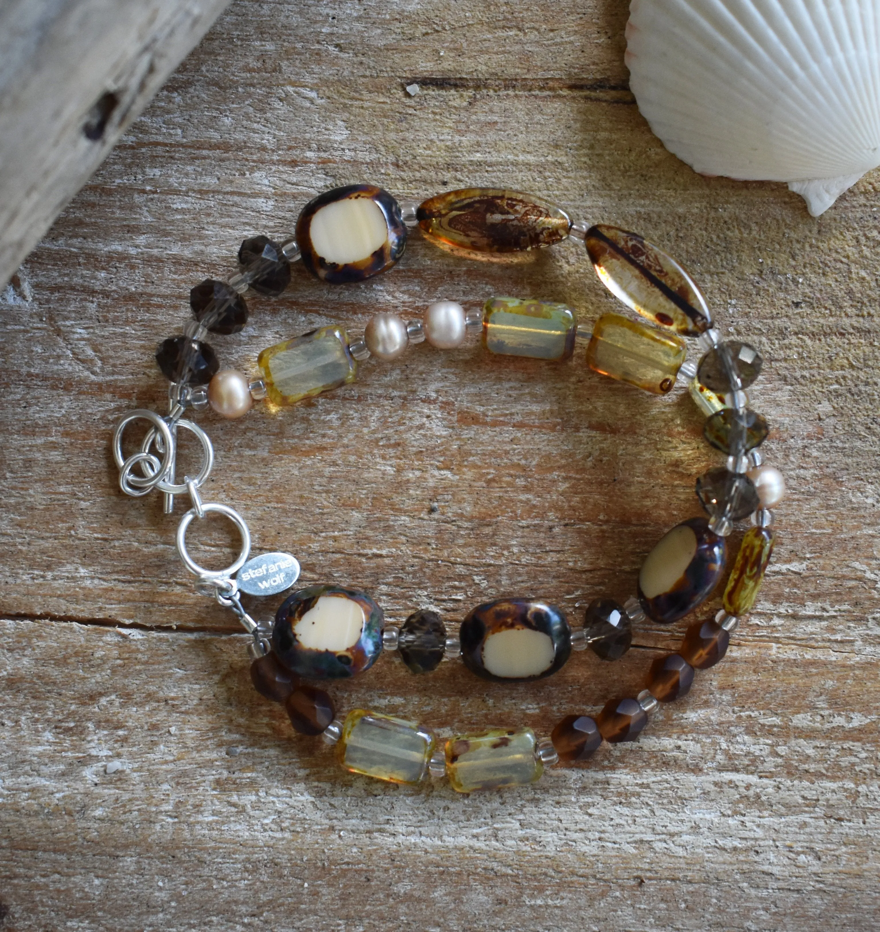 Inspired by winter dunes, this double strand bracelet features freshwater pearls, crystals & Czech glass, with an adjustable sterling silver toggle closure. Adjusts from 7" - 8".