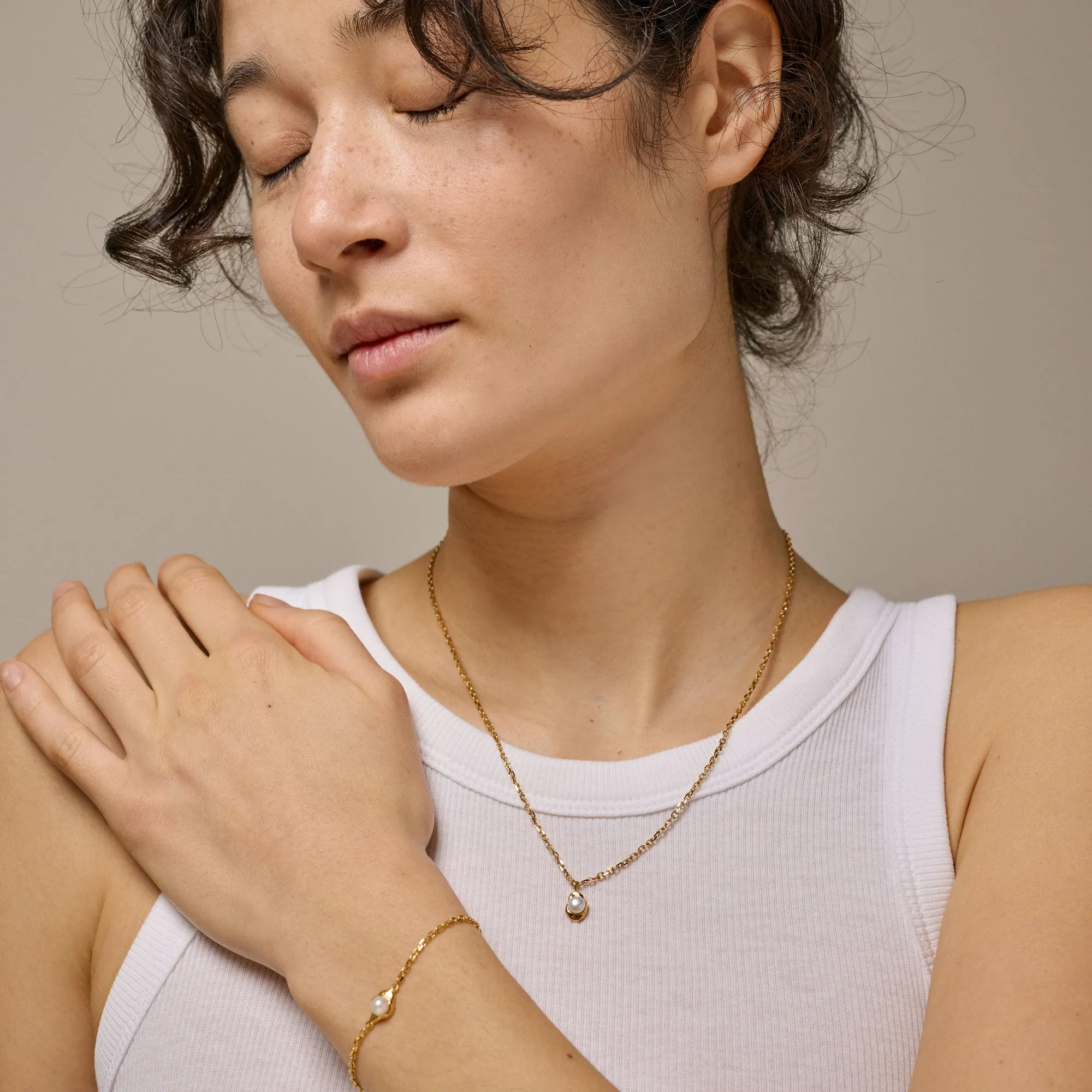 The Darla necklace is an elegant necklace that hides a pearl, enclosed in metal. The pearl of the Darla necklace resembles a strengthening amulet that you always have on you. The necklace is made of 925 sterling silver and coated with 18 karat gold. Darla is also available as a bracelet.