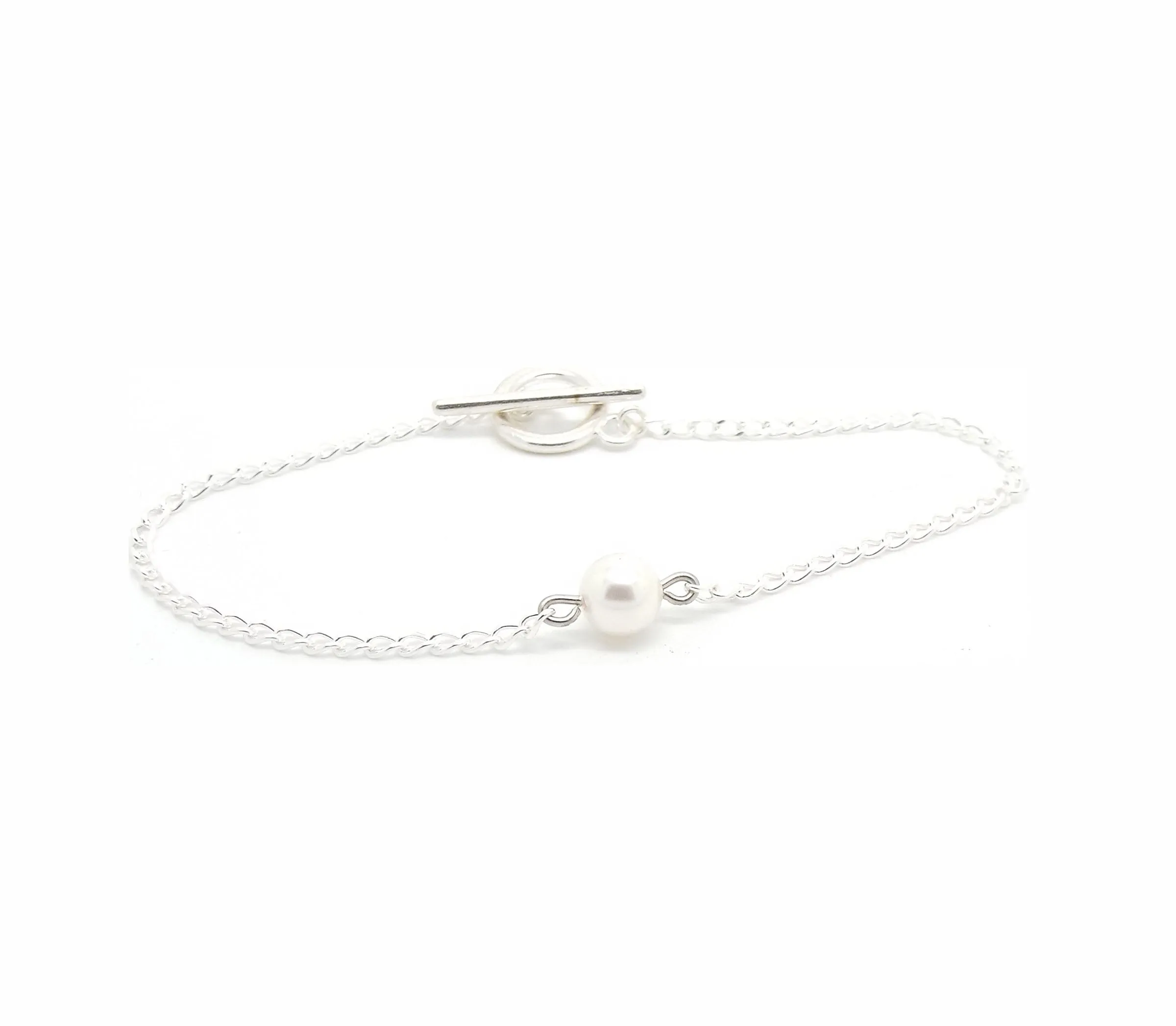 The bracelet consists of an exquisite chain in sterling silver, which is punctuated in the centre by a single hypnotic pearl. The single pearl silver bracelet’s minimalist design means it subtly enhances any outfit, day or night, while the use of pearl is reminiscent of the timeless style of classic chic fashion.