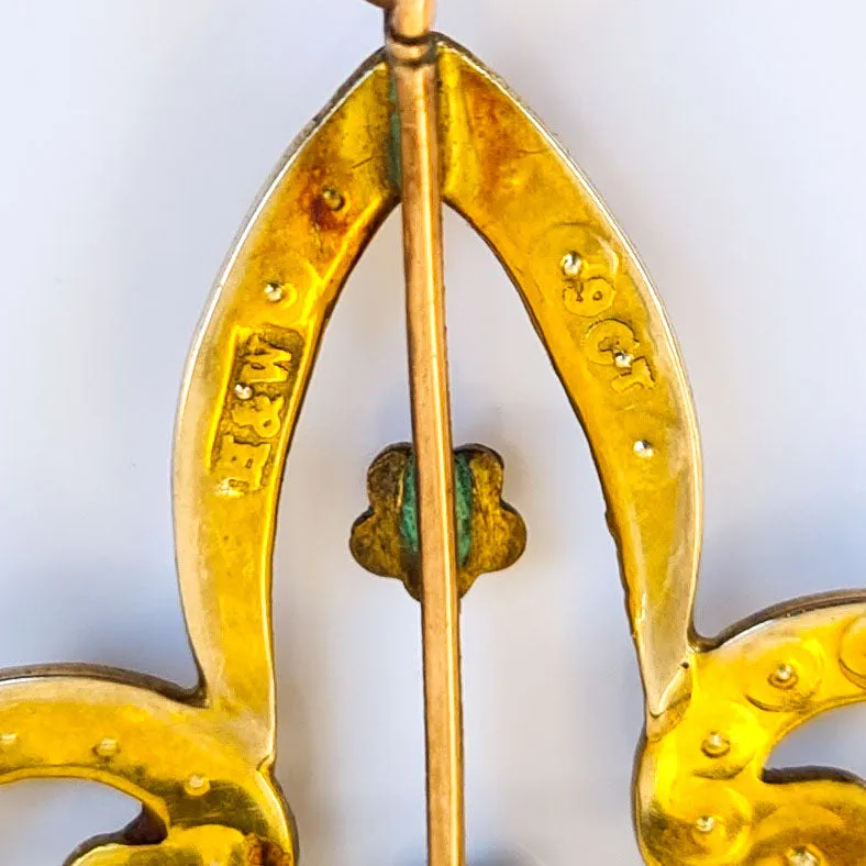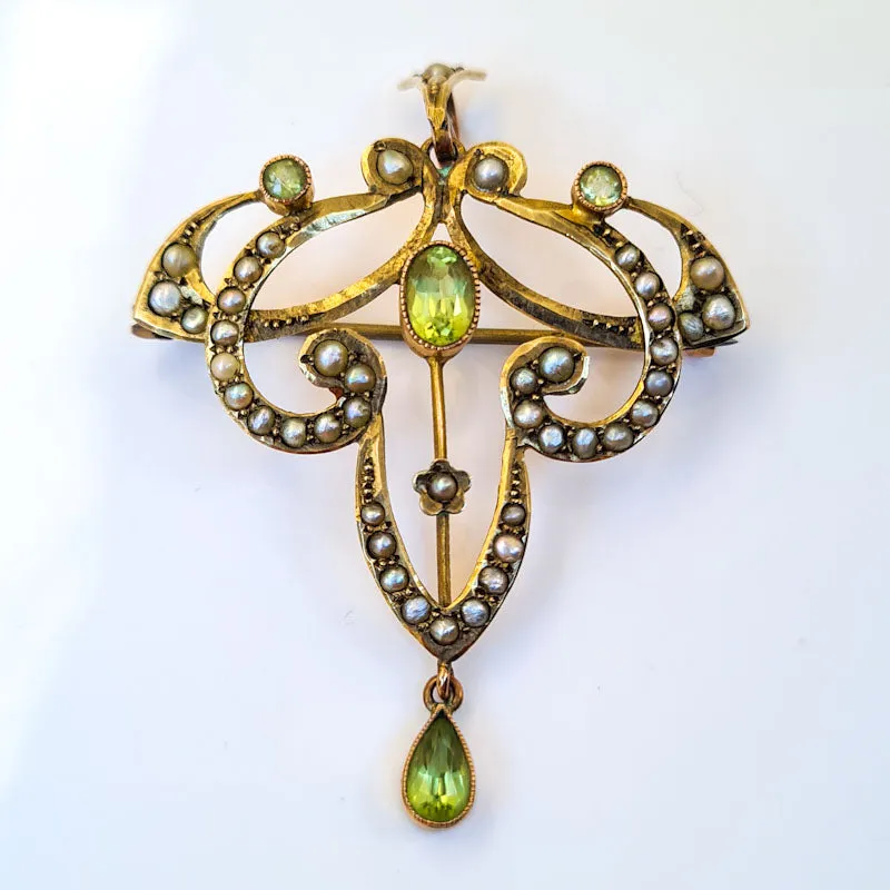 Art Nouveau Peridot and Seed Pearl pendant/brooch set in nine-carat (9ct) yellow gold with an "H&W" maker's mark.