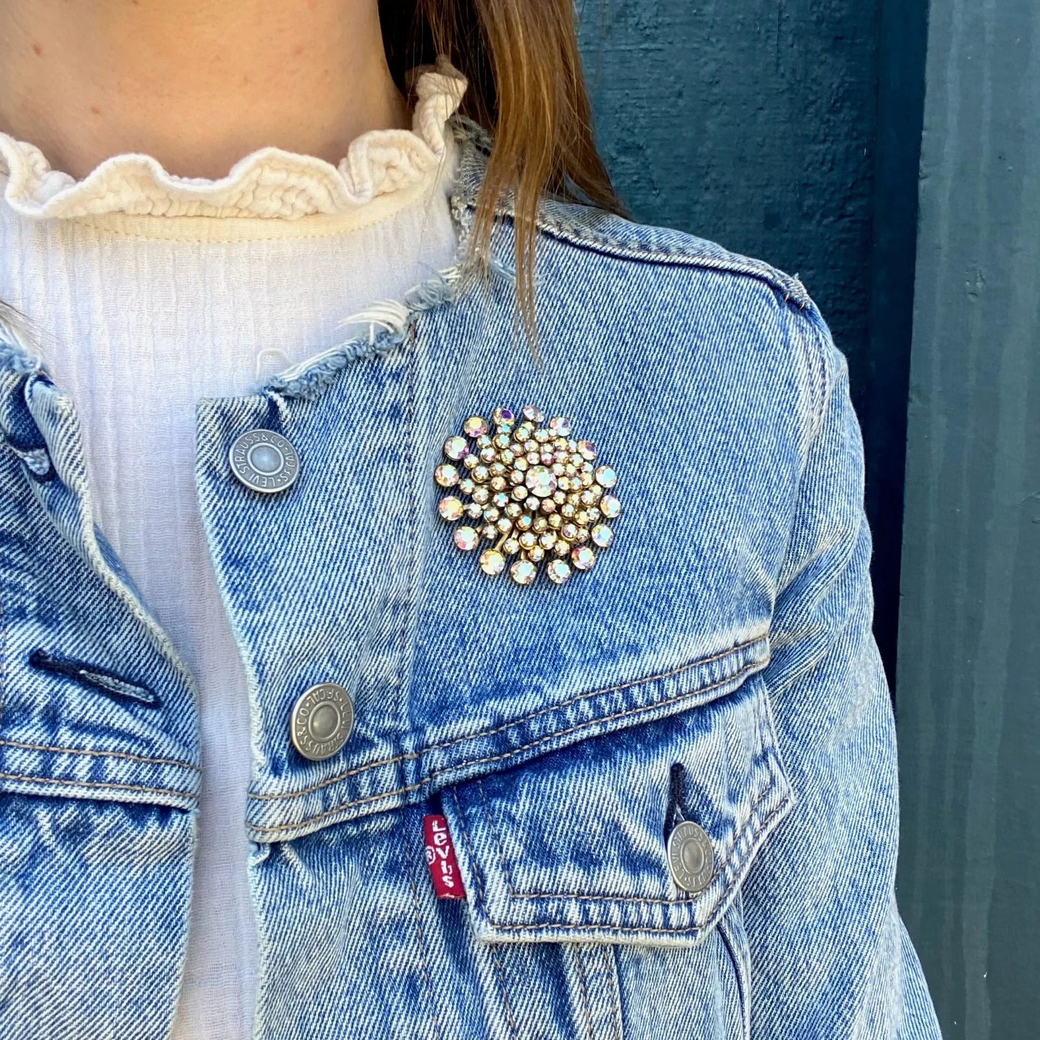 This breathtaking vintage brooch is a scintillating star burst of aurora borealis rhinestones in hues of gold, pink, lavender and teal. It has a wonderful color change under the light. The stones are prong set in a beautifully constructed, three-dimensional setting; several layers of gold-tone costume metal are riveted together to create a sculptural piece with some depth. This wonderful brooch can easily be worked into a formal hairdo by your stylist. Circa 1960.