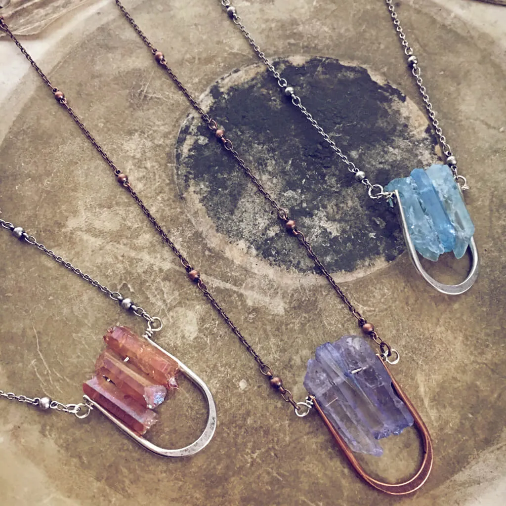 Shimmering iridescent quartz spikes withinthe triptych necklace make for an energizing piece.The 3 rough cut crystal gemstones are paired with either antique silver or antique copper components.