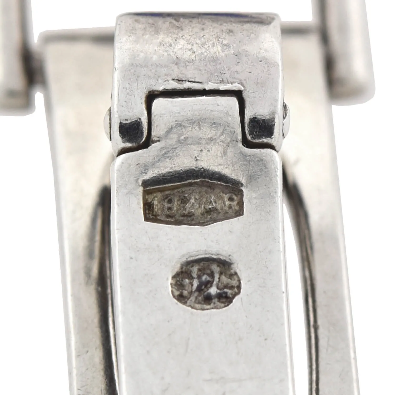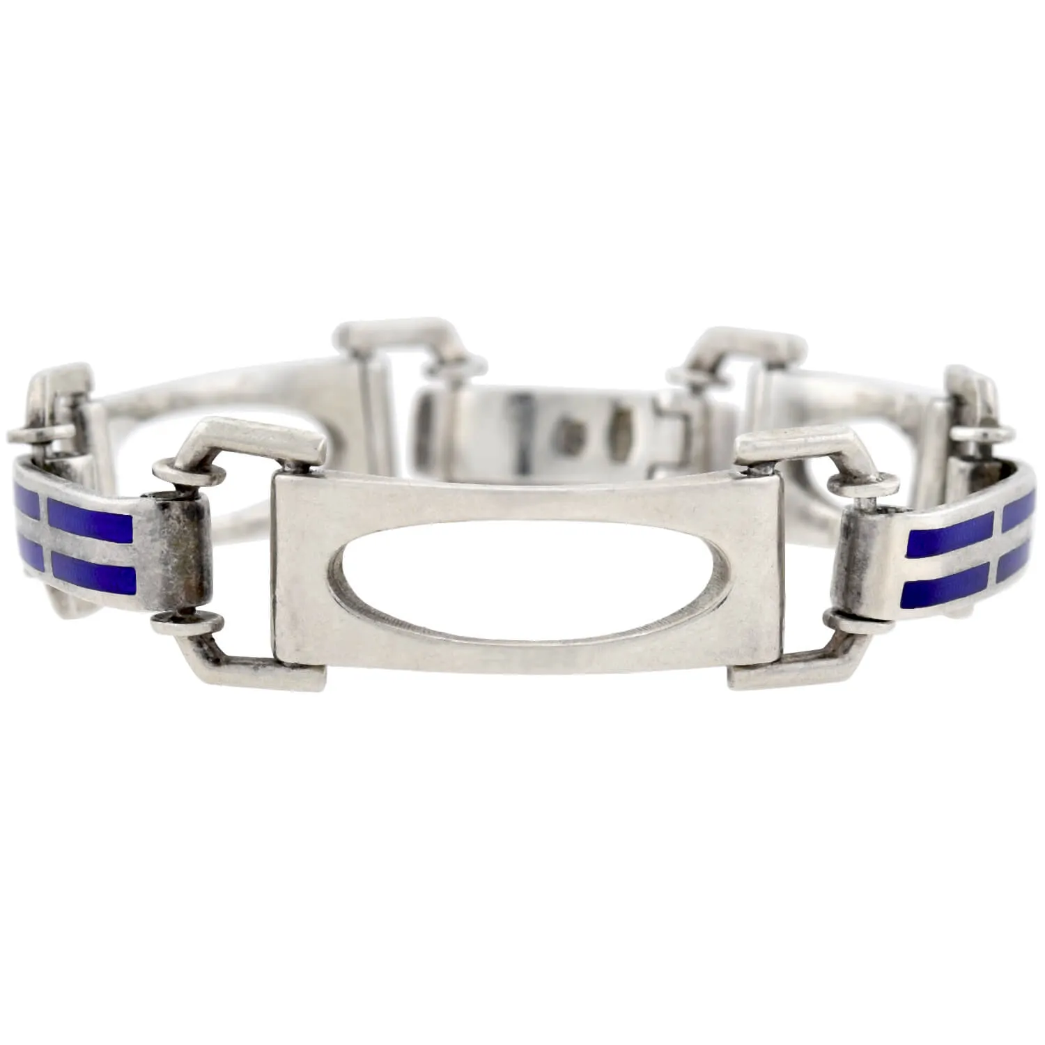 A bold vintage enameled link bracelet from the 1970s era! Crafted in sterling silver, this fabulous piece is comprised of an alternating design of six chunky links that curve comfortably around the wrist. Three of the links are a curved rectangular shape, two long and one short, with an oval cutout center, while the other three links are rectangular, each displaying four royal blue bars of inlaid enameling. The bracelet secures with a discrete fold-over clasp hidden within one of the enameled links, allowing the design to look seamless when worn. There are two markings on the bracelet's underside reading "182AR" in an elongated hexagon and "925". This eye-catching bracelet would make a fabulous addition to any vintage collection!