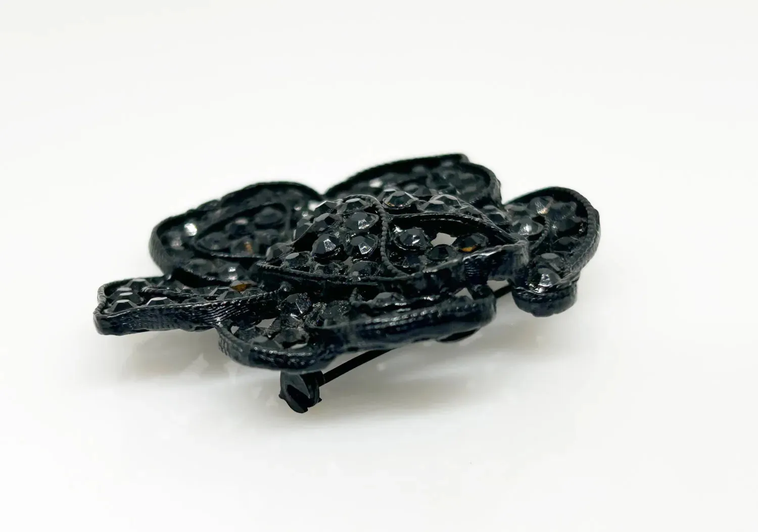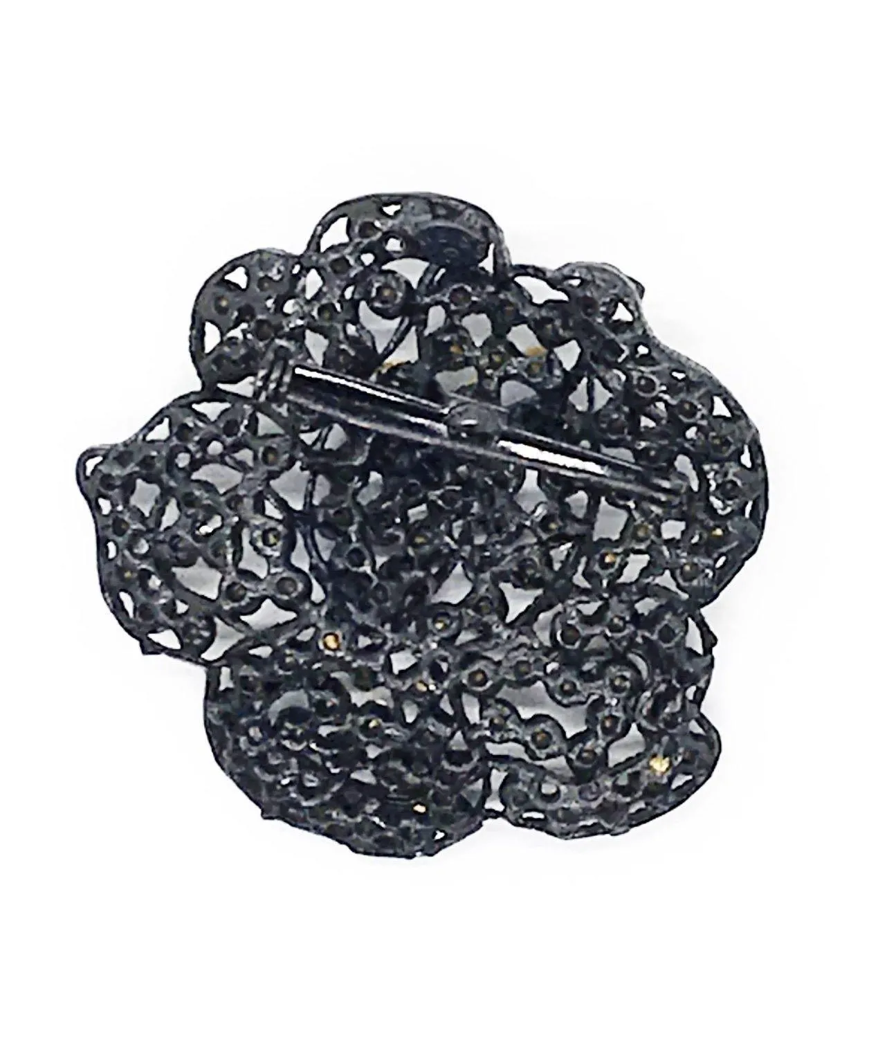 This iconic Weiss brooch is constructed in the form of a rose or flower composed of black metal and black stones. Measuring approximately 2" in width, the signature Weiss label is present within an oval. Bold and beautiful, this vintage brooch is crafted from sleek black metal and adorned with shimmering stones. At 2 inches wide, it's the perfect statement piece for any outfit. The signature Weiss label adds a touch of authenticity to this unique and eye-catching design.